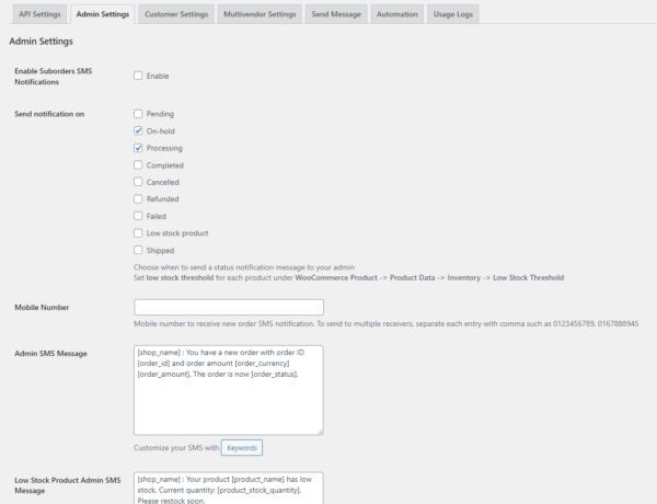 - Customizable Message Tags: [shop_name], [order_id], [order_amount], [order_status], [order_product], [payment_method], [bank_details], [billing_first_name], [billing_last_name], [billing_phone], [billing_email], [billing_company], [billing_address], [billing_country], [billing_city], [billing_state], [billing_postcode].
